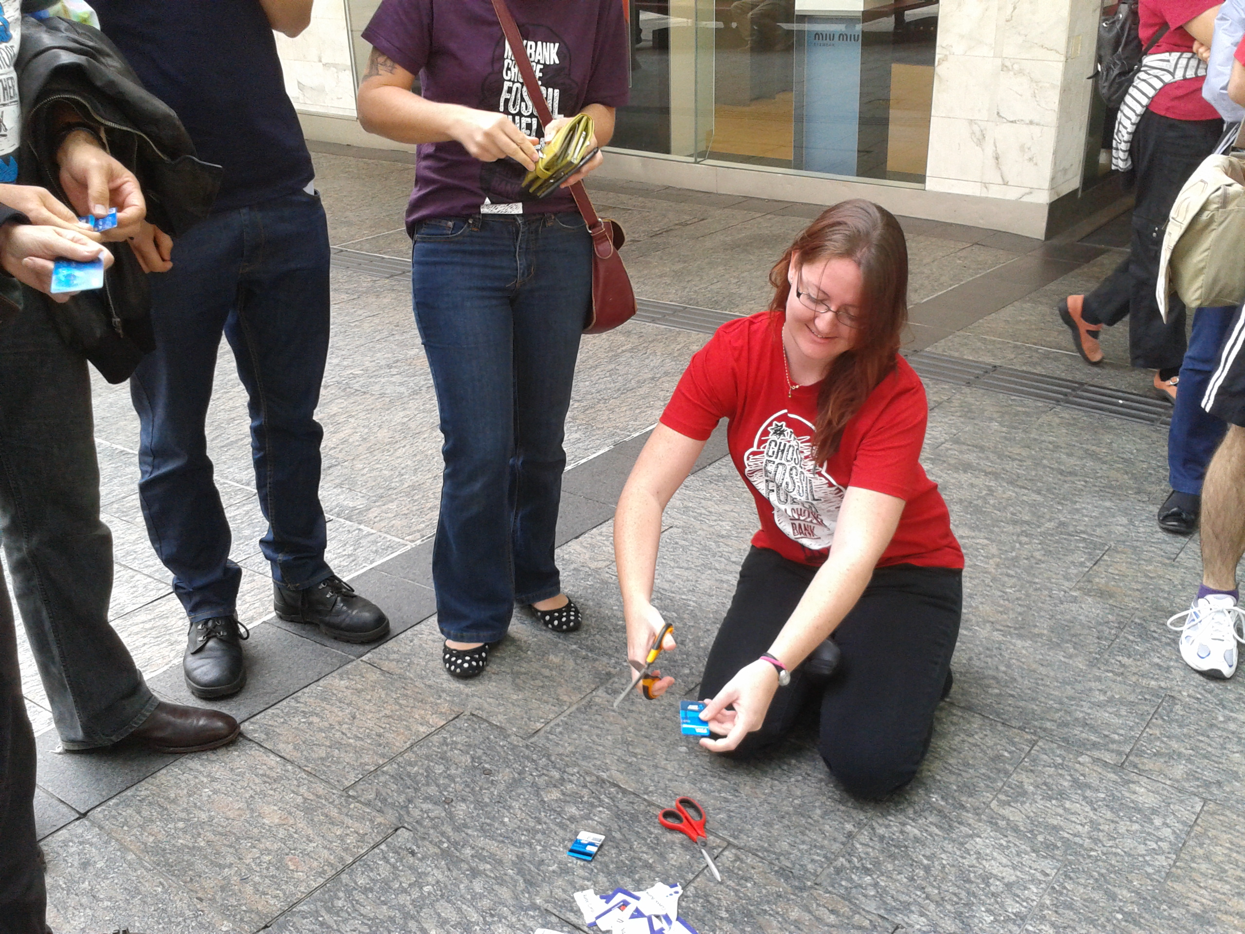 Yesterday I had the great good fortune to attend Brisbane’s Divestment Action at ANZ’s Queen Street Mall branch. While I’m personally in the process of divesting my money from ANZ – so I wasn’t able to join in on cutting up all my cards (drat!) – I was able to lend my support and take some photos to share with everyone who visits polycentrica.